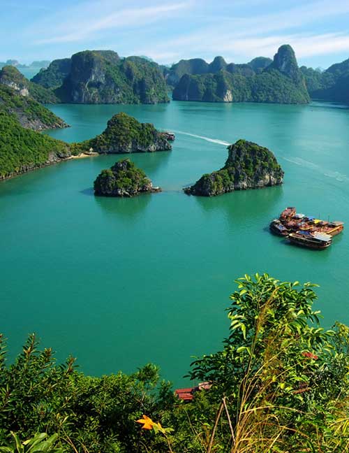 UNESCO World Heritage Site Halong Bay boasts a magnificent scenery of over 3,000 limestone islands jutting out of emerald green waters in the Gulf of Tonkin. The best way to explore and appreciate this vast area is by organised boat tours either cruise boats or traditional junk style boats, sleeping on board for one or several nights.