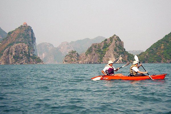 In the morning you leave Hanoi for Halong Bay via the Red River Delta. Welcome on board upon arrival Tuan Chau Harbor. Enjoy a welcome drink. Brief introduction by the cruise manager. Cabin check-in. Lunch is served while the cruise is sailing and passing by thousand of unknown islets. Stop at the Pearl Farm village. Take a kayak around Pearl Farm village. Continue to the Titop Island. Free choice of activities such as sunbathing, swimming or climb up to the peak of the Titop for the panorama view of the Halong bay. Return to the cruise. Join in the Cooking Demonstration by the cruise chef to prepare some Vietnamese dishes followed by the Sunset Cocktail on the Sundeck followed by a Vietnamese set menu dinner. Evening you are free to join some cruise activities including chat around the bar, watching movies of Vietnamese films, playing cards, playing chess, reading or try your luck with squid fishing.