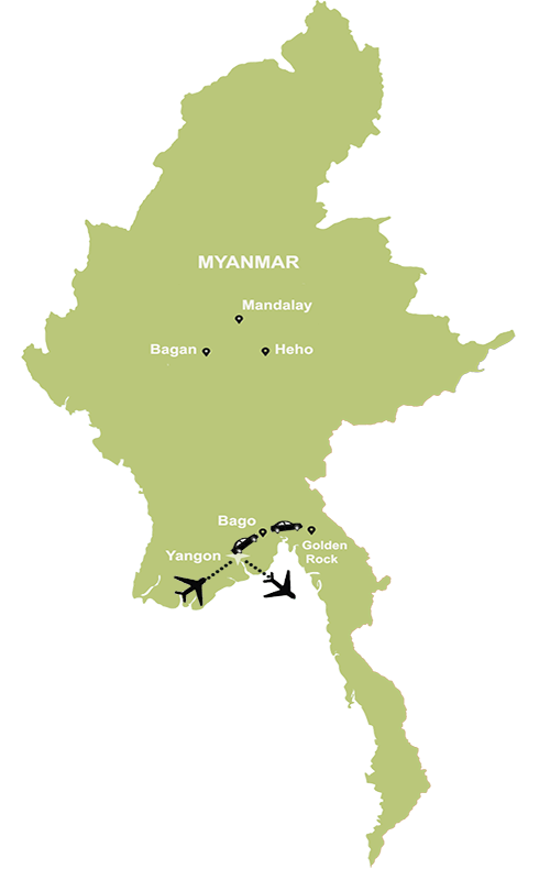 Compact of Myanmar 4 days Beginning with Yangon, the main gateway to the rest of Myanmar and its mighty Shwedagon Pagoda, you also have a chance to visit Bago, the former capital of the Mon Kingdom in the 15th century and especially Golden Rock, one of the three most sacred religious sites in Myanmar and enjoy the panoramic 360 degree views of the surrounding Mon State mountains from the summit. ON REQUEST ON REQUEST Warm welcome upon your arrival in Yangon, the main gateway to the rest of Myanmar. Your guide meets you at the airport for a transfer to your hotel. Free. At leisure. Evening you meet your guide again for welcome dinner at local restaurant. Today you drive to the Golden Rock in the Mount Kyaiktiyo. Stop in Bago, also known as Pegu, the former capital of the Mon Kingdom in the 15th century to visit the Kyat Kha Wine monastery and the 55-metre long reclining Shwethalyaung Buddha. Continue driving to the Kyaikhtiyo base camp to take an open-air truck along a winding road to the truck station before you have a short walk to reach the Golden Rock, one of the three most sacred religious sites in Myanmar. Enjoy the panoramic 360 degree views of the surrounding Mon State mountains from the summit. Again the open-air truck transfer you to the base camp to rejoin your car back to Yangon. Afternoon is time to explore the Yangon including Bogyoke Market, formerly known as Scott’s market which is famous for its wide selection of Myanmar handicrafts. Continue to the Chaukhtatgyi Pagoda, one of Myanmar’s more beautiful reclining buddhas. The last stop of the day is the Shwedagon Pagoda, one of the wonders of the world, built 2,500 years ago. Enjoy breathtaking views of the golden stupa from this vantage point. Today is the last day of your trip. Enjoy your free time at your hotel or you can do your last minute souvenir shopping before transfer to airport for your flight home. Have a good journey and thanks for joining us. Located in the up market vicinity of Embassies, Shopping Centers, Food Outlets, National Museum and the People’s Park. The hotel is a short 5-minute walk to the iconic 2,600 year old Shwedagon Pagoda or a 5 minute drive to the famous Bogyoke Market. Its a 10 minutes drive to Downtown and 30 minutes to and from Yangon International Airport. MOUNTAIN TOP HOTEL – GOLDEN ROCK It is at a vantage point commanding a panoramic view of the lush mountain ranges below, where one can experience spectacular sunrise and sunset – sights you will long remember. Only a 5-minute walk to the Golden Rock Pagoda at the top of Mount Kyaiktiyo, the Mountain Top Hotel is ideally located for those who wish to make frequent visits to this wonder of South East Asia…. Situated among lush greenery and beside the famous Kandawgyi Lake, the hotel provides plenty of views that are simply a few stunning and spectacular. Every guestroom is spaciously designed and furnished to reflect the luxurious surroundings, with breathtaking views of Shwedagon Pagoda. MOUNTAIN TOP HOTEL – GOLDEN ROCK It is at a vantage point commanding a panoramic view of the lush mountain ranges below, where one can experience spectacular sunrise and sunset – sights you will long remember. Only a 5-minute walk to the Golden Rock Pagoda at the top of Mount Kyaiktiyo, the Mountain Top Hotel is ideally located for those who wish to make frequent visits to this wonder of South East Asia…. ``We just got back. I can't begin to tell you how wonderful it was. We loved every place we stayed. You're a gem. As to the countries themselves: I was totally thrilled, fascinated, absorbed. Hope to do another trip to the region soon. Thanks for all your help.`` Myanmar Culture The Impressive Myanmar includes the three most important cultural and mystical destinations in Myanmar: Yangon, Bagan, and Mandalay. You also visit the famous....